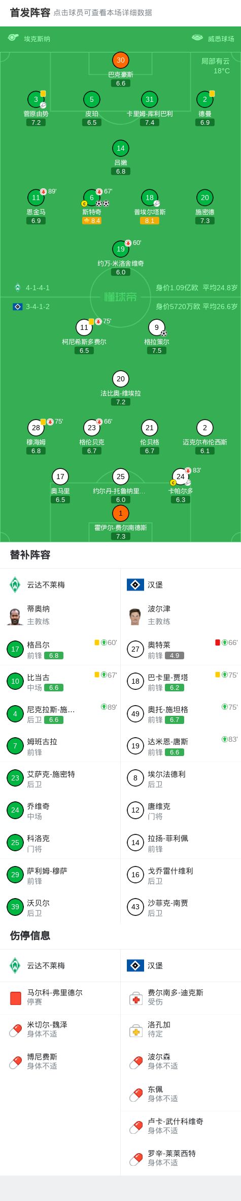北京时间4月18日德国足球顶级联赛 联赛 第30轮,云达不莱梅主场对阵汉堡。云达不莱梅斯特奇梅开二度,普埃尔塔斯破门。汉堡格拉策尔破门。最终比分云达不莱梅 3-1 汉堡。