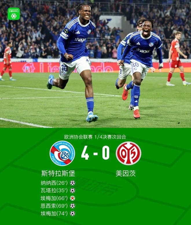 北京时间4月17日欧洲协会联赛 1/4决赛次回合,斯特拉斯堡对阵美因茨。上半场纳纳西首开记录,瓦塔拉破门扩大领先优势,下半场巴尔科造点埃梅加主罚点球被扑出,恩西索破门再下一城,埃梅加进球锁定胜局。最终比分斯特拉斯堡 4-0 美因茨。两回合总比分斯特拉斯堡4-2美因茨晋级4强。